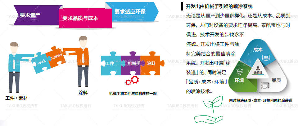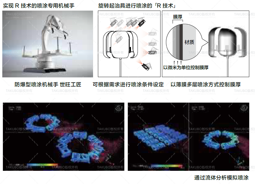 摒棄“只要能噴涂就行”的簡單思維,泰酷寶攜手自研的R技術,巧妙地將一系列機械單元融匯貫通,構筑起一套能夠滿足多樣化噴涂需求的綜合系統。這一技術精粹在于其能夠對工件執行精確的旋轉噴涂,涵蓋了從專業治具的設計,到涂料供給系統的精細調控、自動噴槍的高效應用,乃至模擬噴涂的智能優化和涂料及能源成本的經濟節約,每一步都旨在實現客戶的絕對滿意。致力于提供高品質、環保且高效的噴涂解決方案,泰酷寶將持續推動技術創新,滿足客戶期待。