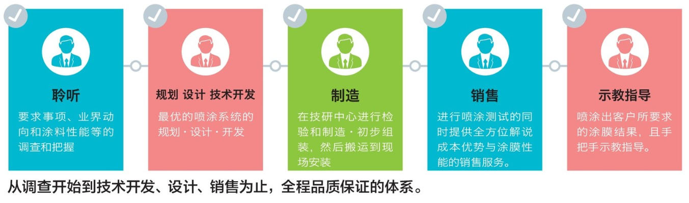作為涂裝解決方案提供商,我們以解決客戶的要求、難題為出發(fā)點(diǎn),從確認(rèn)生產(chǎn)環(huán)境開始直至完成設(shè)計(jì)構(gòu)想。試噴涂、制造、搬入安裝、然后進(jìn)行噴涂生產(chǎn)。提供開發(fā)、制造、銷售等一條龍服務(wù)。