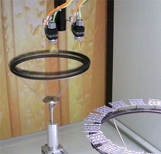 旋轉(zhuǎn)機能通過磁體式旋轉(zhuǎn)裝置得以實現(xiàn)。以非接觸形式進行旋轉(zhuǎn)工件的旋轉(zhuǎn)噴涂。可進行正逆旋轉(zhuǎn)。(現(xiàn)在與泰酷寶獨自開發(fā)制作的旋轉(zhuǎn)式工作轉(zhuǎn)臺機構(gòu)相搭配)